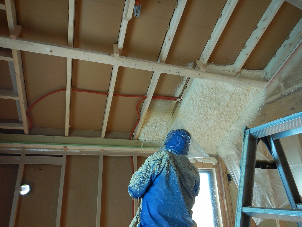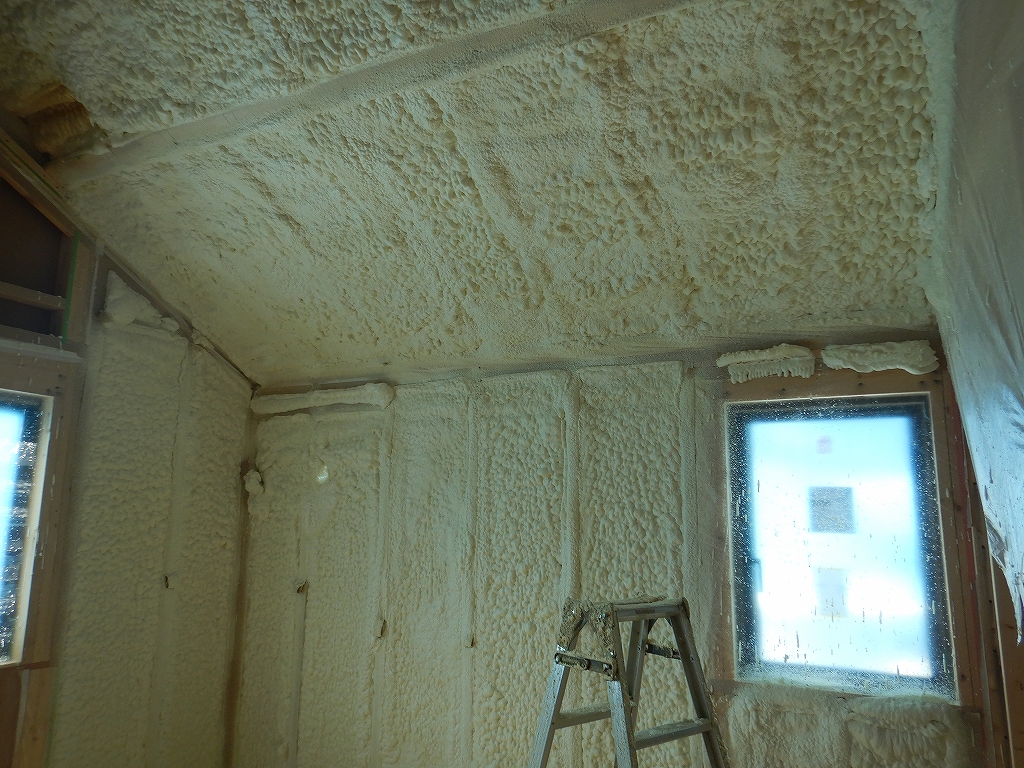 内部のウレタン吹付断熱施工状況。